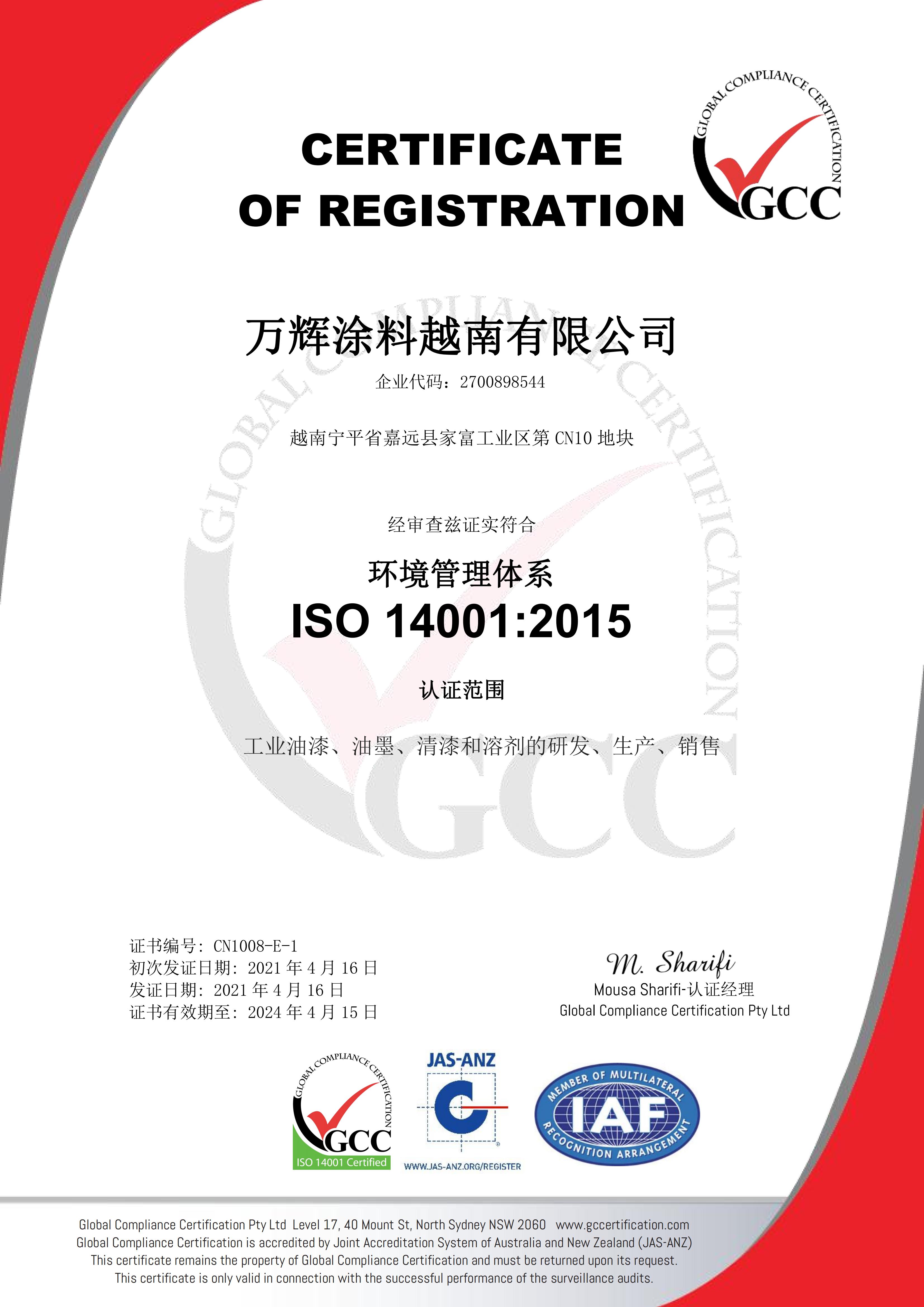 TUV ISO 14001: 2015 (萬(wàn)輝越南)